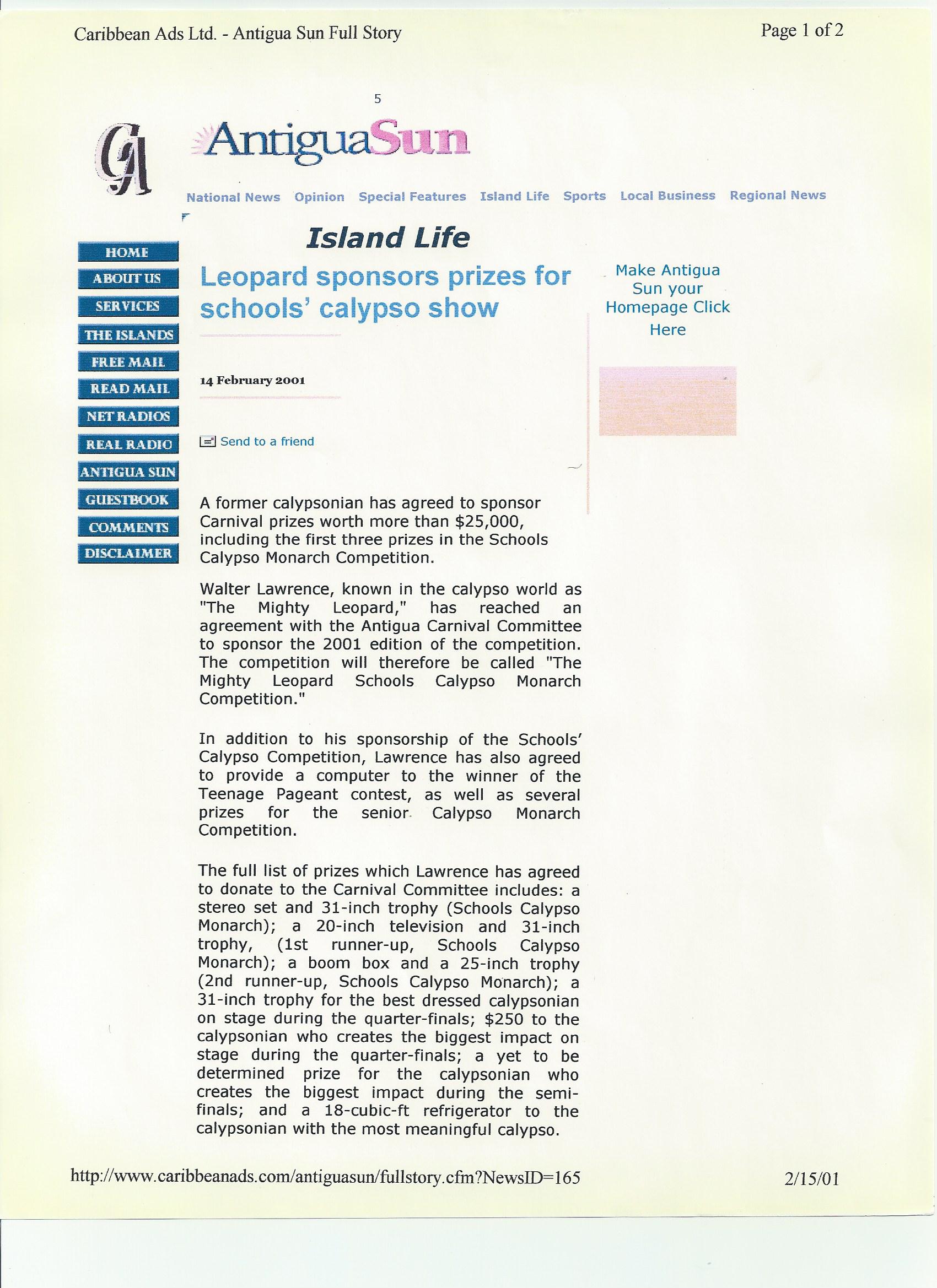In 2001, we've sponsored the Junior Calypso Competition, to the tune of $ 20,000 EC ,to help the Juniors develop their skills  to the benefit of the art form
